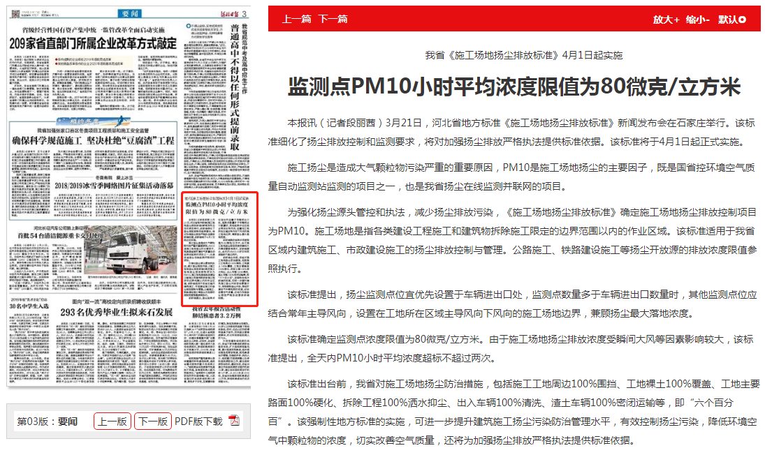 河北日报:我省《施工场地扬尘排放标准》4月1日起实施 监测点PM10小时平均浓度限值为80微克/立方米