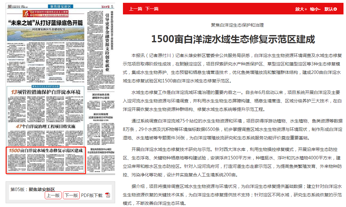 河北日报:聚焦白洋淀生态保护和治理 1500亩白洋淀水域生态修复示范区建成