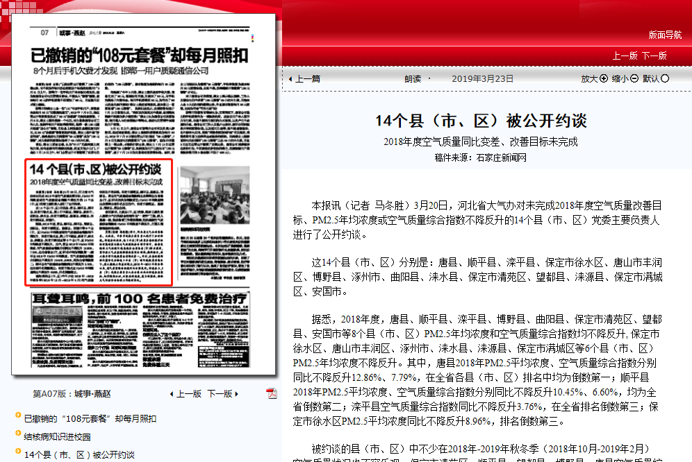 被约谈的县(市、区)中不少在2018年-2019年秋冬季(2018年10月-2019年2月)空气质量状况也不容乐观。保定市清苑区、顺平县、望都县、博野县、唐县空气质量综合指数同比改善率在全省各县(市、区)排名依次为倒数前五;PM2.5平均浓度同比改善率全省排名后五位中,保定市清苑区、望都县、博野县、唐县在列。