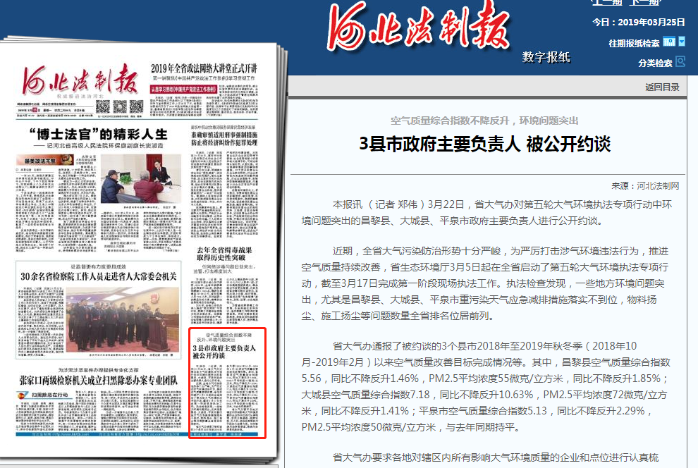 本报讯 (记者 郑伟)3月22日,省大气办对第五轮大气环境执法专项行动中环境问题突出的昌黎县、大城县、平泉市政府主要负责人进行公开约谈。