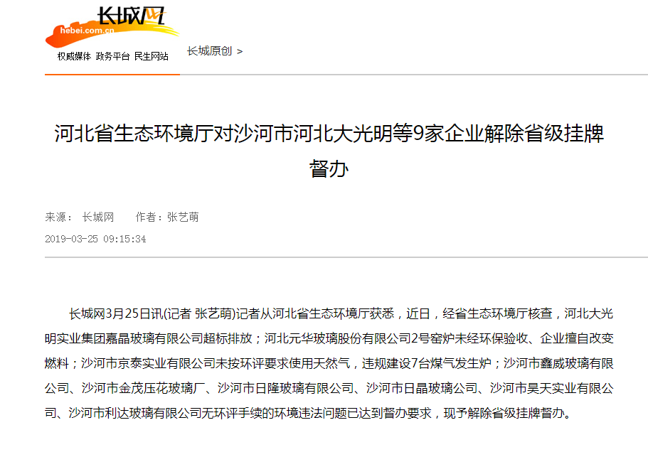 长城网3月25日讯(记者 张艺萌)记者从杏彩(中国)官方网站 获悉,近日,经杏彩(中国)官方网站 核查,河北大光明实业集团嘉晶玻璃有限公司超标排放;河北元华玻璃股份有限公司2号窑炉未经环保验收、企业擅自改变燃料;沙河市京泰实业有限公司未按环评要求使用天然气,违规建设7台煤气发生炉;沙河市鑫威玻璃有限公司、沙河市金茂压花玻璃厂、沙河市日隆玻璃有限公司、沙河市日晶玻璃公司、沙河市昊天实业有限公司、沙河市利达玻璃有限公司无环评手续的环境违法问题已达到督办要求,现予解除省级挂牌督办。