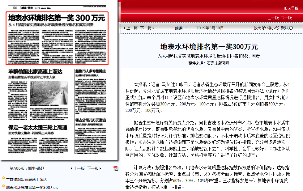 召开的新闻发布会上获悉,从4月份起,《河北省城市地表水环境质量达标情况通报排名和奖惩问责办法(试行)》将正式实施。每个月对11个设区市地表水环境质量达标情况进行通报排名,月度排名前3位的市将分别奖励300万元、200万元、100万元;排名后3位的市将分别扣减300万元、200万元、100万元。
