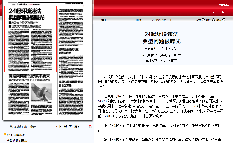 石家庄(3起):位于裕华区的石家庄中晟安全印刷有限公司,未按要求安装VOCS收集处理设施,挥发性有机物直排。位于藁城区的河北白沙烟草有限公司违反环评批复要求,擅自增建5台卷包机,违法生产。位于井陉县的际华3514制革制鞋有限公司井陉分公司无环保审批手续、无排污许可证违法生产;制胶车间未密闭,异味污染严重;VOCS收集治理设施监测口未按要求密闭。
