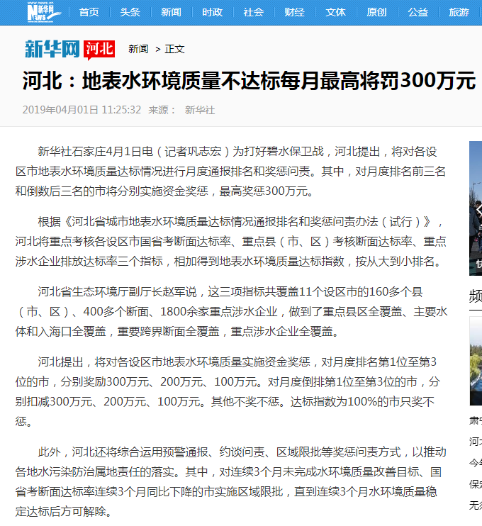 新华社石家庄4月1日电(记者巩志宏)为打好碧水保卫战,河北提出,将对各设区市地表水环境质量达标情况进行月度通报排名和奖惩问责。其中,对月度排名前三名和倒数后三名的市将分别实施资金奖惩,最高奖惩300万元。
