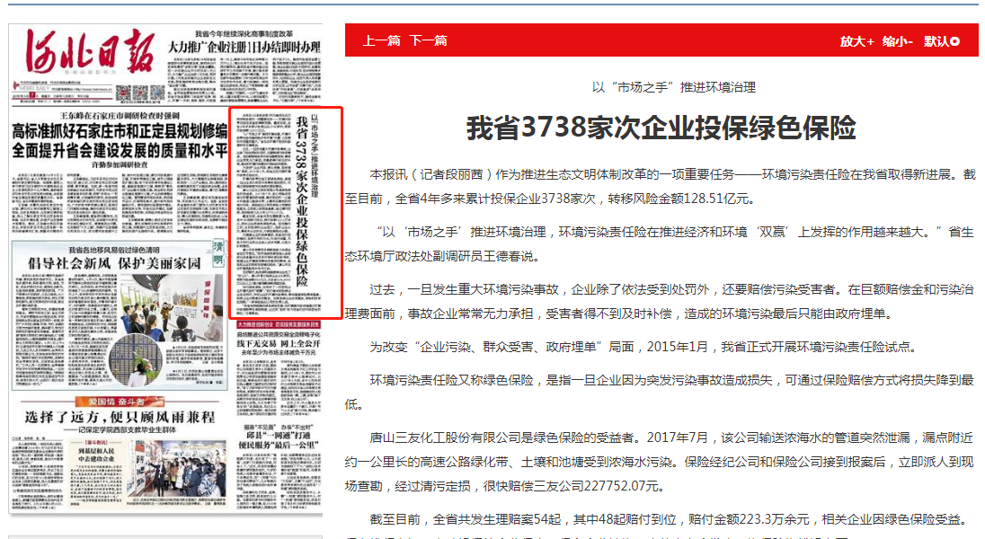 唐山三友化工股份有限公司是绿色保险的受益者。2017年7月,该公司输送浓海水的管道突然泄漏,漏点附近约一公里长的高速公路绿化带、土壤和池塘受到浓海水污染。保险经纪公司和保险公司接到报案后,立即派人到现场查勘,经过清污定损,很快赔偿三友公司227752.07元。