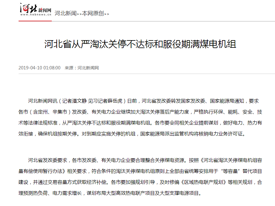 河北省发改委要求,各市发改委、有关电力企业要合理整合关停煤电资源。按照《河北省淘汰关停煤电机组容量有偿使用暂行办法》相关要求,符合条件的淘汰关停煤电机组原则上全部由省统筹安排用于“等容量”替代项目建设,并通过交易容量方式获取经济补偿。各市要加强规划引导,及时修编《区域热电联产规划》等相关规划,合理预测热负荷、电力需求增长,谋划布局大型高效热电联产项目及大型支撑电源项目。
