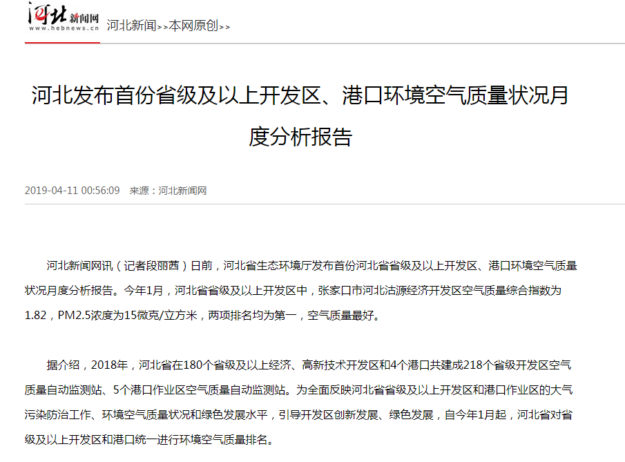 据介绍,2018年,河北省在180个省级及以上经济、高新技术开发区和4个港口共建成218个省级开发区空气质量自动监测站、5个港口作业区空气质量自动监测站。为全面反映河北省省级及以上开发区和港口作业区的大气污染防治工作、环境空气质量状况和绿色发展水平,引导开发区创新发展、绿色发展,自今年1月起,河北省对省级及以上开发区和港口统一进行环境空气质量排名。