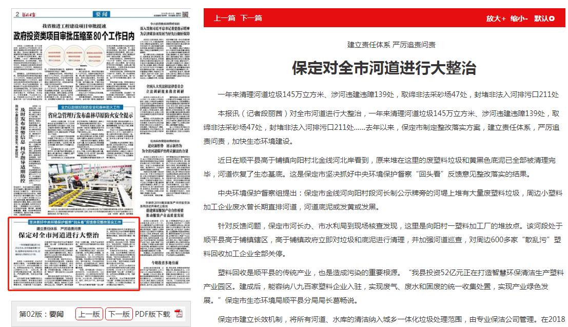 保定市建立长效机制,将所有河道、水库的清洁纳入城乡一体化垃圾处理范围,由专业保洁公司管理。在2018年建立市、县、乡、村四级河长制组织体系后,今年1月又对市级河长进行调整,市级领导分任不同市管河道河长,其中市委书记、市长在担任市级总河长外,还分别担任孝义河、府河河长。阜平、安国等地还探索建立了河道警长制度。