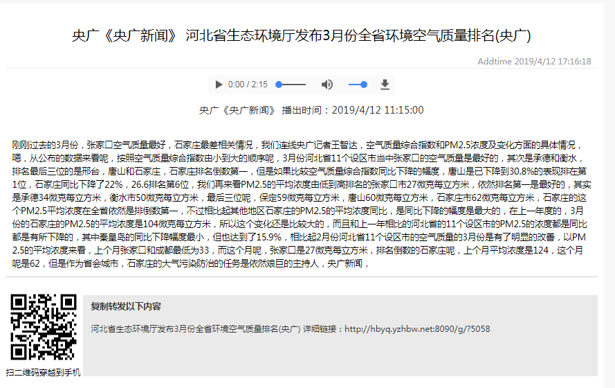 央广《央广新闻》:杏彩(中国)官方网站 发布3月份全省环境空气质量排名