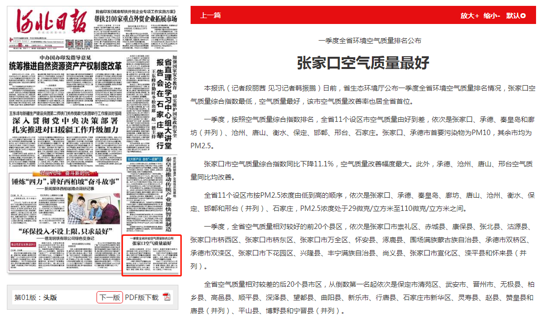 张家口市空气质量综合指数同比下降11.1%,空气质量改善幅度最大。此外,承德、沧州、唐山、邢台空气质量同比均改善。