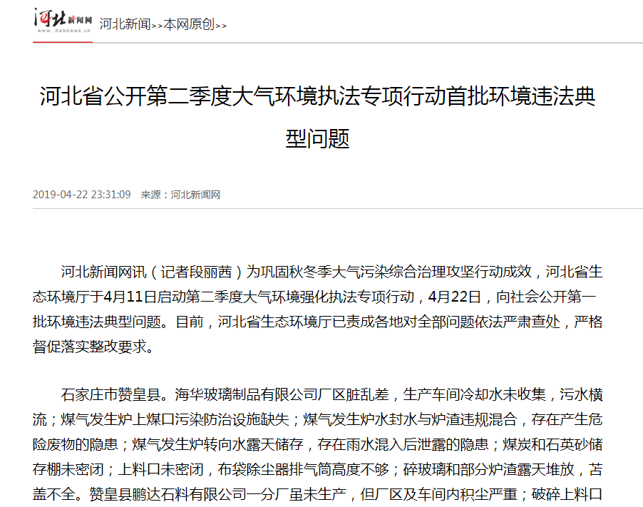 石家庄市赞皇县。海华玻璃制品有限公司厂区脏乱差,生产车间冷却水未收集,污水横流;煤气发生炉上煤口污染防治设施缺失;煤气发生炉水封水与炉渣违规混合,存在产生危险废物的隐患;煤气发生炉转向水露天储存,存在雨水混入后泄露的隐患;煤炭和石英砂储存棚未密闭;上料口未密闭,布袋除尘器排气筒高度不够;碎玻璃和部分炉渣露天堆放,苫盖不全。赞皇县鹏达石料有限公司一分厂虽未生产,但厂区及车间内积尘严重;破碎上料口未密闭,无收集处理设施;原料棚密闭不严,棚内下料口无收集处理设施,雾炮不能使用;成品料棚下料口无收集处理设施;物料运输廊道有破损,廊道检查孔积尘严重。河北汇泽瓷业有限公司原料上料口与球磨机之间输送廊道集尘罩有破损,部分粉尘直排;上料口集尘罩设置不规范。河北新玻尔瓷业有限公司排污许可证核发不规范,未按规定对主要污染物排放浓度、主要生产设备数量型号等提出明确要求;料棚内8条上料口与球磨机之间的输送廊道设置不规范,部分粉尘无组织排放;8个物料上料口集气系统破损,收集处理效果差;南煤棚内输送带、滚动筛污染防治设施缺失,部分粉尘直排。