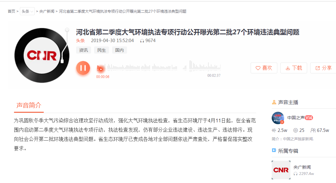 中国之声《央广新闻》:河北省第二季度大气环境执法专项行动公开曝光第二批27个环境违法典型问题(4.30)