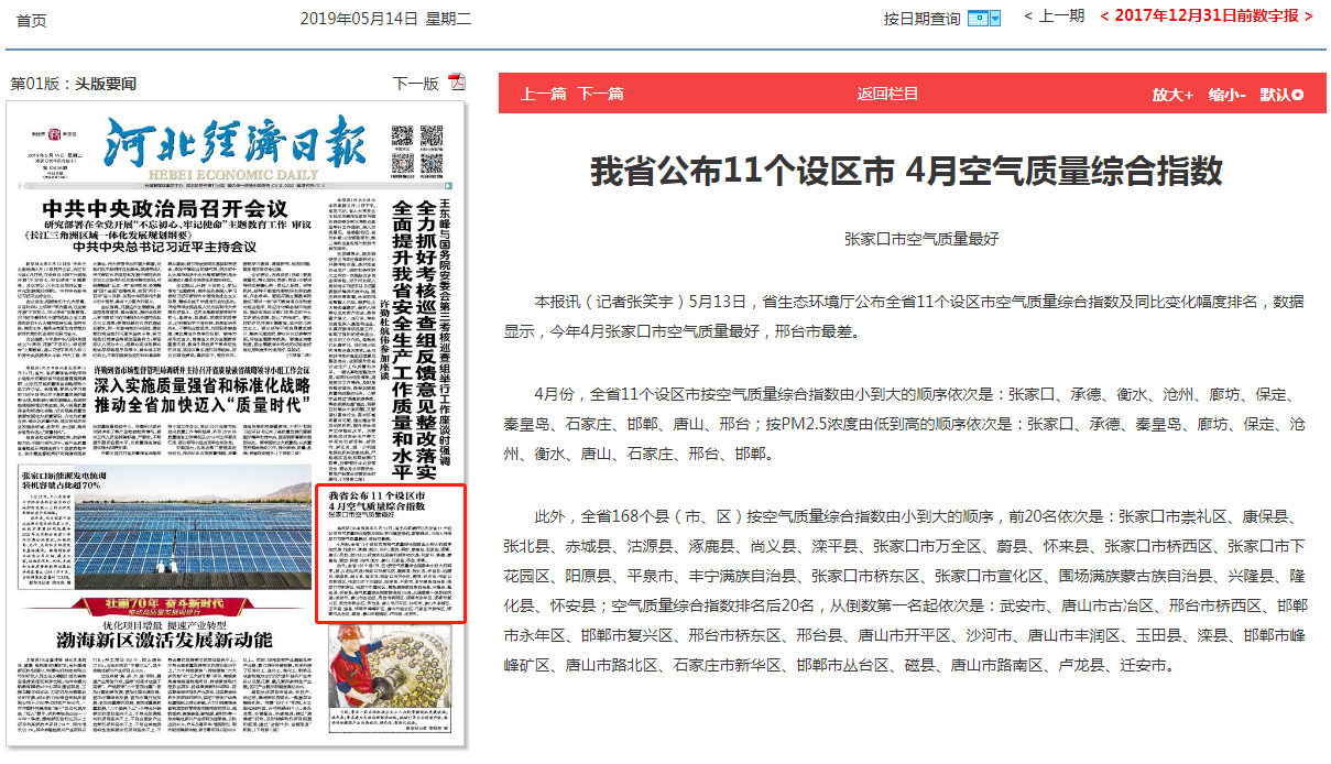 本报讯(记者张笑宇)5月13日,杏彩(中国)官方网站 公布全省11个设区市空气质量综合指数及同比变化幅度排名,数据显示,今年4月张家口市空气质量最好,邢台市最差。