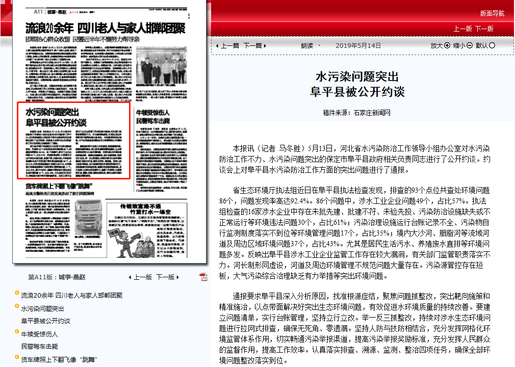 本报讯(记者 马冬胜)5月13日,河北省水污染防治工作领导小组办公室对水污染防治工作不力、水污染问题突出的保定市阜平县政府相关负责同志进行了公开约谈。约谈会上对阜平县水污染防治工作方面的突出问题进行了通报。