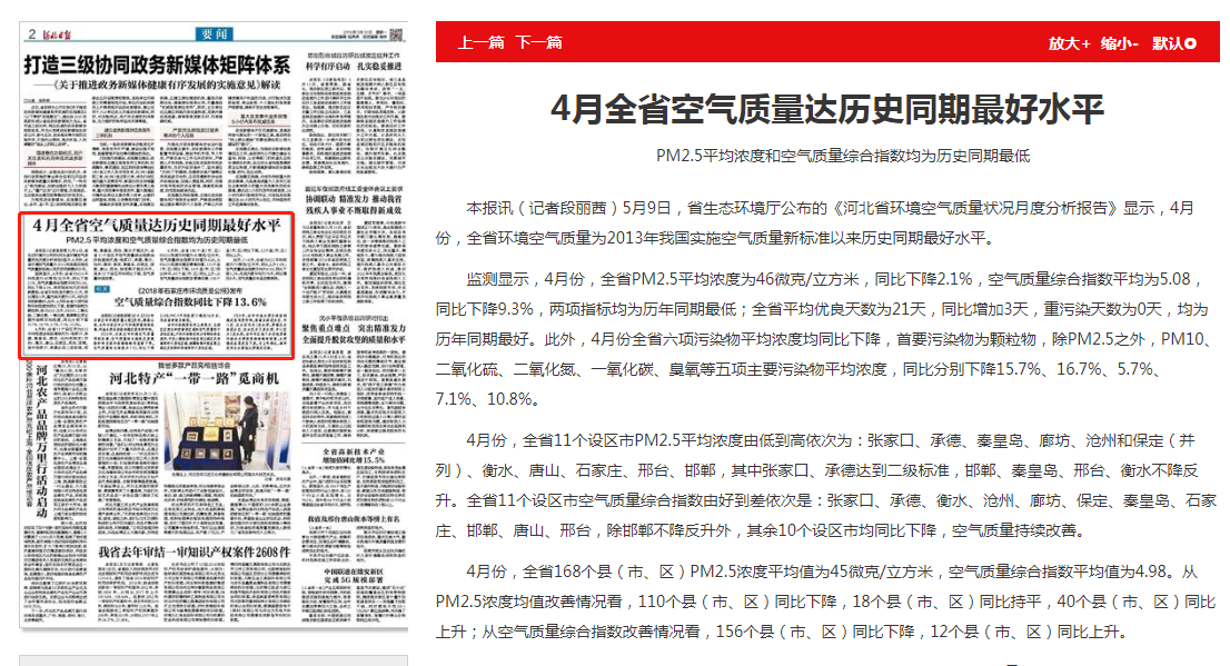 本报讯(记者段丽茜)5月9日,杏彩(中国)官方网站 公布的《河北省环境空气质量状况月度分析报告》显示,4月份,全省环境空气质量为2013年我国实施空气质量新标准以来历史同期最好水平。