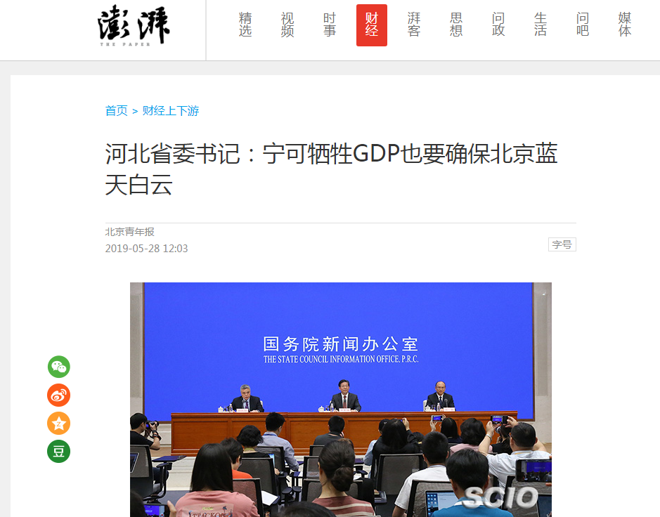 澎湃新闻:河北省委书记 宁可牺牲GDP也要确保北京蓝天白云