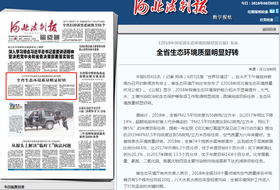 向社会发布了《2018年河北省生态环境质量状况公报》。《公报》显示,2018年我省生态环境保护能力和水平显著提升,大气、水、土壤污染防治和生态保护等各项工作取得明显成效,圆满完成目标任务,生态环境质量明显好转。