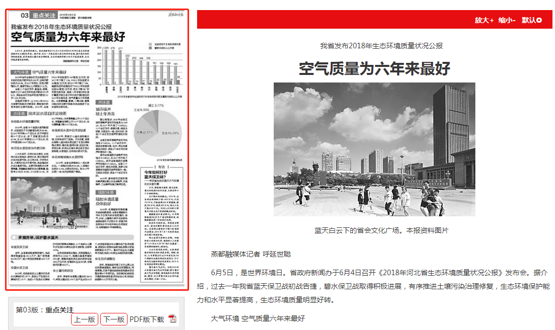 6月5日,是世界环境日。省政府新闻办于6月4日召开《2018年河北省生态环境质量状况公报》发布会。据介绍,过去一年我省蓝天保卫战初战告捷,碧水保卫战取得积极进展,有序推进土壤污染治理修复,生态环境保护能力和水平显著提高,生态环境质量明显好转。