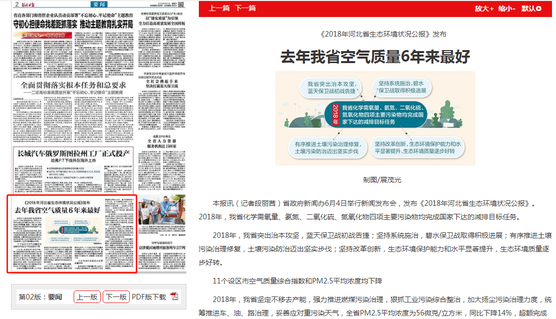 2018年,我省坚定不移去产能,强力推进燃煤污染治理,狠抓工业污染综合整治,加大扬尘污染治理力度,统筹推进车、油、路治理,妥善应对重污染天气,全省PM2.5平均浓度为56微克/立方米,同比下降14%,超额完成年度目标任务,提前一年实现《河北省打赢蓝天保卫战三年行动方案》提出的目标任务,空气质量为6年来最好。