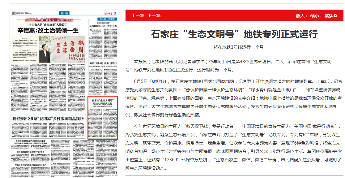 6月5日10时04分,在石家庄市地铁1号线北国商城站,记者登上开往洨河大道方向的地铁列车。上车后,记者感受到浓厚的生态文化氛围:“像保护眼睛一样保护生态环境”“绿水青山就是金山银山”……列车墙壁被装饰成清爽的蓝色、绿色等,上面有美丽的图案、生态环境建设的文字介绍;地铁电视上播放的是我省环保公众开放的宣传片。同时,大学生志愿者在车厢内开展生态环保志愿服务活动,发放生态环保宣传资料,传播生态文明科普知识,激发社会各界践行绿色生活的热情。