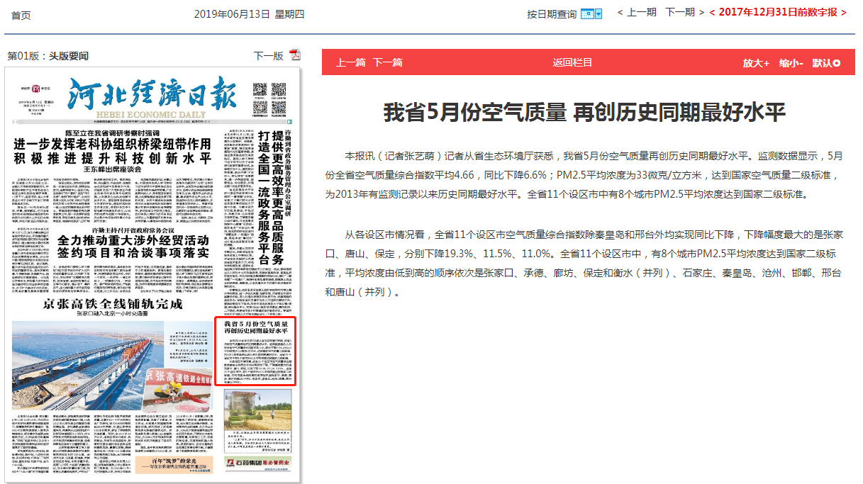 从各设区市情况看,全省11个设区市空气质量综合指数除秦皇岛和邢台外均实现同比下降,下降幅度最大的是张家口、唐山、保定,分别下降19.3%、11.5%、11.0%。全省11个设区市中,有8个城市PM2.5平均浓度达到国家二级标准,平均浓度由低到高的顺序依次是张家口、承德、廊坊、保定和衡水(并列)、石家庄、秦皇岛、沧州、邯郸、邢台和唐山(并列)。