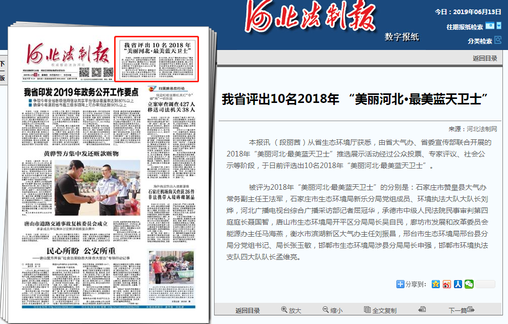获悉,由省大气办、省委宣传部联合开展的2018年“美丽河北·最美蓝天卫士”推选展示活动经过公众投票、专家评议、社会公示等阶段,于日前评选出10名2018年“美丽河北·最美蓝天卫士”。