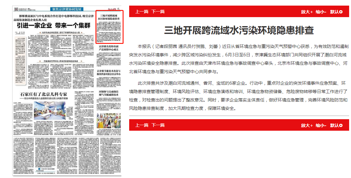 本报讯(记者段丽茜 通讯员付贺鹏、刘蕾)近日从省环境应急与重污染天气预警中心获悉,为有效防范和遏制突发水污染环境事件,减少跨区域污染纠纷发生,6月3日至6日,京津冀杏彩门共同组织开展了潮白河流域水污染环境安全隐患排查。此次排查由天津市环境应急与事故调查中心牵头,北京市环境应急与事故调查中心、河北省环境应急与重污染天气预警中心共同参与。