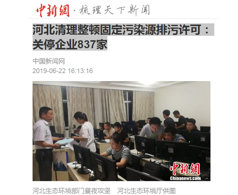 中新网:河北清理整顿固定污染源排污许可:关停企业837家