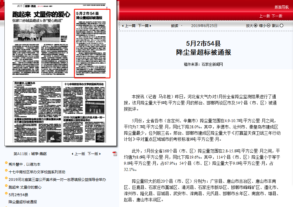 燕赵晚报:5月2市54县 降尘量超标被通报
