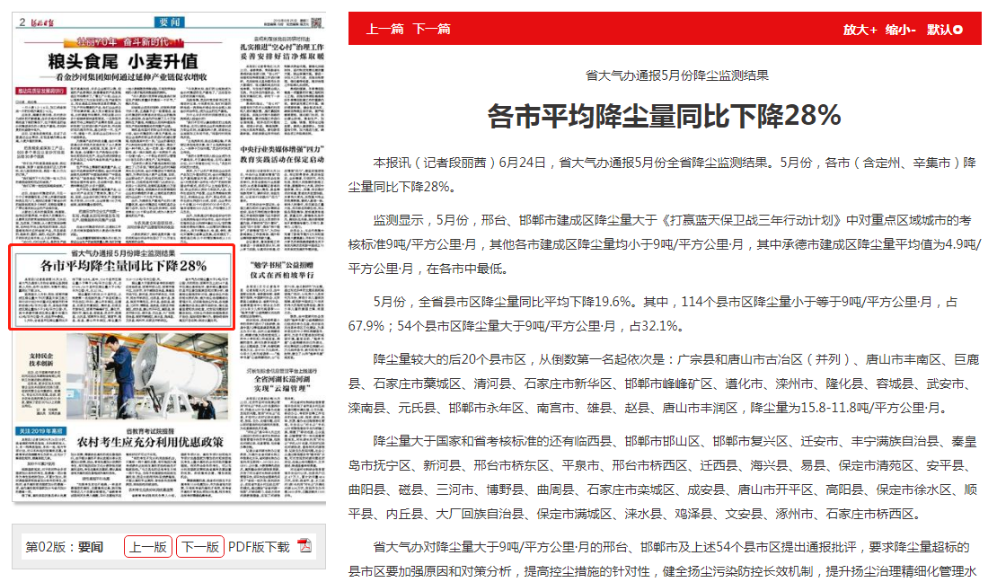 监测显示,5月份,邢台、邯郸市建成区降尘量大于《打赢蓝天保卫战三年行动计划》中对重点区域城市的考核标准9吨/平方公里·月,其他各市建成区降尘量均小于9吨/平方公里·月,其中承德市建成区降尘量平均值为4.9吨/平方公里·月,在各市中最低。