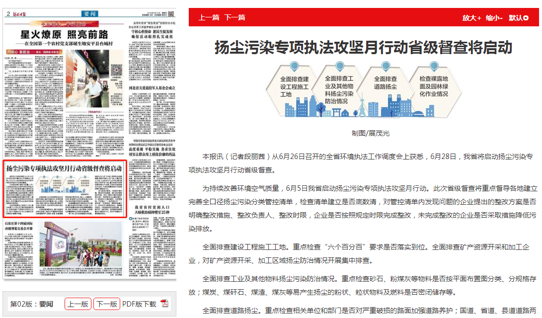 为持续改善环境空气质量,6月5日我省启动扬尘污染专项执法攻坚月行动。此次省级督查将重点督导各地建立完善全口径扬尘污染分类管控清单,检查清单建立是否底数清,对管控清单内发现问题的企业提出的整改方案是否明确整改措施、整改负责人、整改时限,企业是否按照规定时限完成整改,未完成整改的企业是否采取措施降低污染排放。