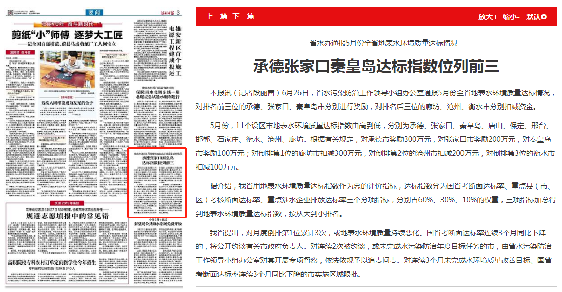 5月份,11个设区市地表水环境质量达标指数由高到低,分别为承德、张家口、秦皇岛、唐山、保定、邢台、邯郸、石家庄、衡水、沧州、廊坊。根据有关规定,对承德市奖励300万元,对张家口市奖励200万元,对秦皇岛市奖励100万元;对倒排第1位的廊坊市扣减300万元,对倒排第2位的沧州市扣减200万元,对倒排第3位的衡水市扣减100万元。