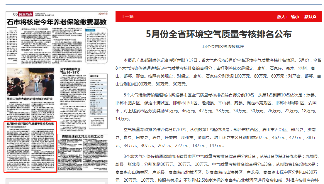 燕赵都市报:5月份全省环境空气质量考核排名公布