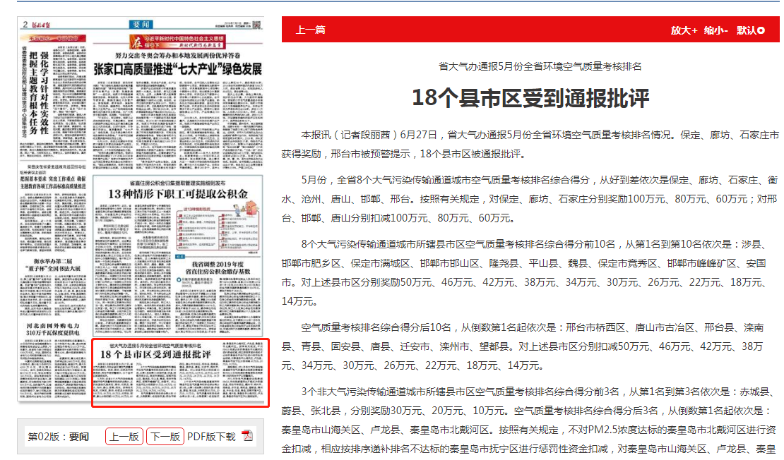 河北日报: 省大气办通报5月份全省环境空气质量考核排名 18个县市区受到通报批评
