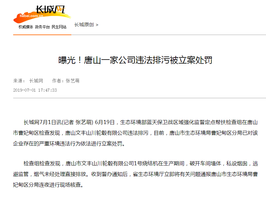 经核查,该企业问题实为1号烧结机筛分间烟尘收集系统管道改造项目未按要求向当地杏彩门备案,改造过程中也未停产,筛分车间未密闭,造成部分烟气直接排放,对大气环境造成严重污染。唐山市生态环境局曹妃甸区分局立即下达整改通知书,并对该企业存在的严重环境违法行为依法进行立案处罚。