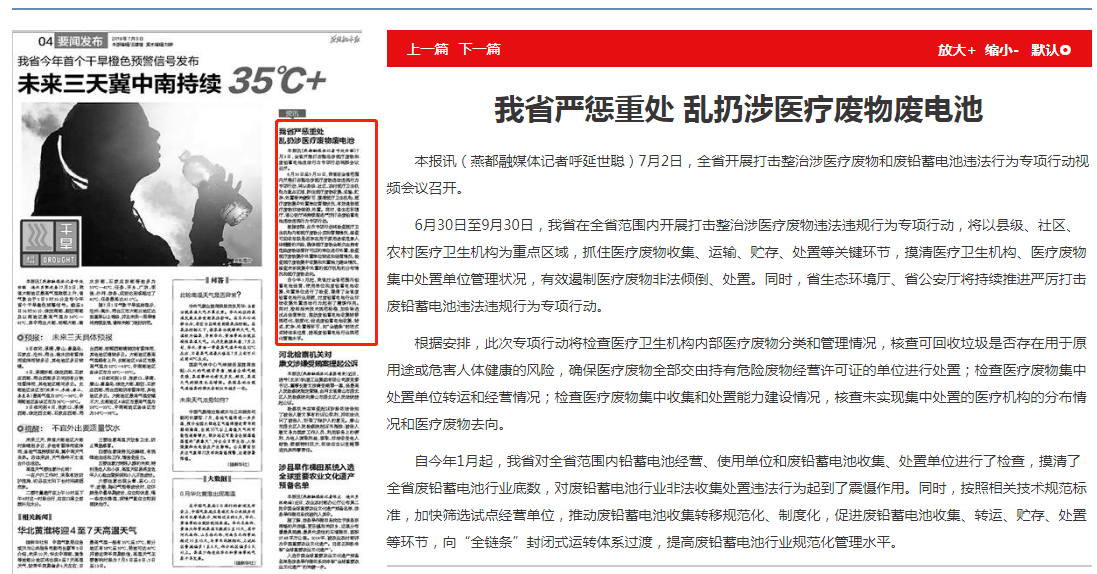 6月30日至9月30日,我省在全省范围内开展打击整治涉医疗废物违法违规行为专项行动,将以县级、社区、农村医疗卫生机构为重点区域,抓住医疗废物收集、运输、贮存、处置等关键环节,摸清医疗卫生机构、医疗废物集中处置单位管理状况,有效遏制医疗废物非法倾倒、处置。同时,杏彩(中国)官方网站 、省公安厅将持续推进严厉打击废铅蓄电池违法违规行为专项行动。