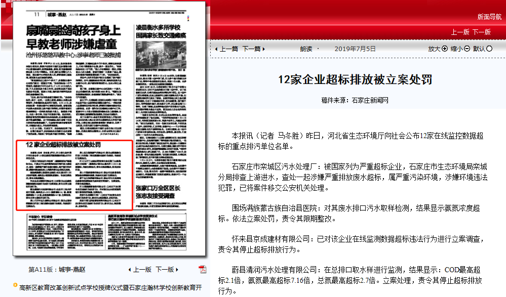 向社会公布12家在线监控数据超标的重点排污单位名单。 石家庄市栾城区污水处理厂:被国家列为严重超标企业,石家庄市生态环境局栾城分局排查上游进水,查处一起涉嫌严重排放废水超标,属严重污染环境,涉嫌环境违法犯罪,已将案件移交公安机关处理。 围场满族蒙古族自治县医院:对其废水排口污水取样检测,结果显示氨氮浓度超标。依法立案处罚,责令其限期整改。 怀来县京成建材有限公司:已对该企业在线监测数据超标违法行为进行立案调查,责令其停止超标排放行为。 蔚县清润污水处理有限公司:在总排口取水样进行监测,结果显示:COD最高超标2.1倍,氨氮最高超标7.16倍,总氮最高超标2.7倍。立案处理,责令其停止超标排放行为。 唐山市开平区久顺钙业有限公司:该企业竖窑脱硫除尘排放口烟尘超标违法行为属实。依法进行立案处罚。 唐山东方炼焦制气有限公司:该企业脱硫除尘排放口污染物二氧化硫超标违法行为属实。依法进行立案处罚。 河北玉田工业园区管理委员会后湖工业聚集区污水处理厂:数据显示该企业废水排口COD连续超标,依法立案处罚,责令其限期整改,实现达标排放。 唐山市蓝欣玻璃有限公司:该公司在线自动监测设备故障频次较高,依法对其进行立案处罚。 肃宁县方华养殖有限公司:该公司污水处理站在线自动监测设备无法保证正常运行,立案查处,并责令限期整改。 河北瑞通碳素股份有限公司:已对其下达《责令改正违法行为决定书》,并对该企业未按照规范使用自动监控设施,立案处罚。 武安市永鼎煤矸石砖厂:已对其下达《责令改正违法行为决定书》,要求企业限期整改、达标排放。 武安市增玉新型墙体材料有限公司:已对其下达《责令改正违法行为决定书》,要求企业,限期整改、达标排放。