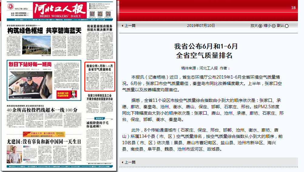 公布2019年1-6月全省环境空气质量情况。6月份,张家口市空气质量最佳,秦皇岛市同比改善幅度最大。上半年,张家口空气质量以及改善幅度均居首位。 据悉,全省11个设区市按空气质量综合指数由小到大的顺序依次是:张家口、承德、廊坊、秦皇岛、沧州、衡水、唐山、保定、邯郸、石家庄、邢台。按PM2.5浓度同比下降幅度由大到小的顺序依次是:张家口、唐山、沧州、承德、廊坊、石家庄、邢台、保定、邯郸、衡水、秦皇岛。 此外,8个传输通道城市(石家庄、保定、邢台、邯郸、沧州、衡水、廊坊、唐山)所属134个县(市、区)空气质量排名,按空气质量综合指数从小到大的顺序,前10名县(市、区)依次是:景县、唐山市曹妃甸区、盐山县、沧州市新华区、海兴县、南皮县、阜平县、魏县、沧州市运河区、故城县。
