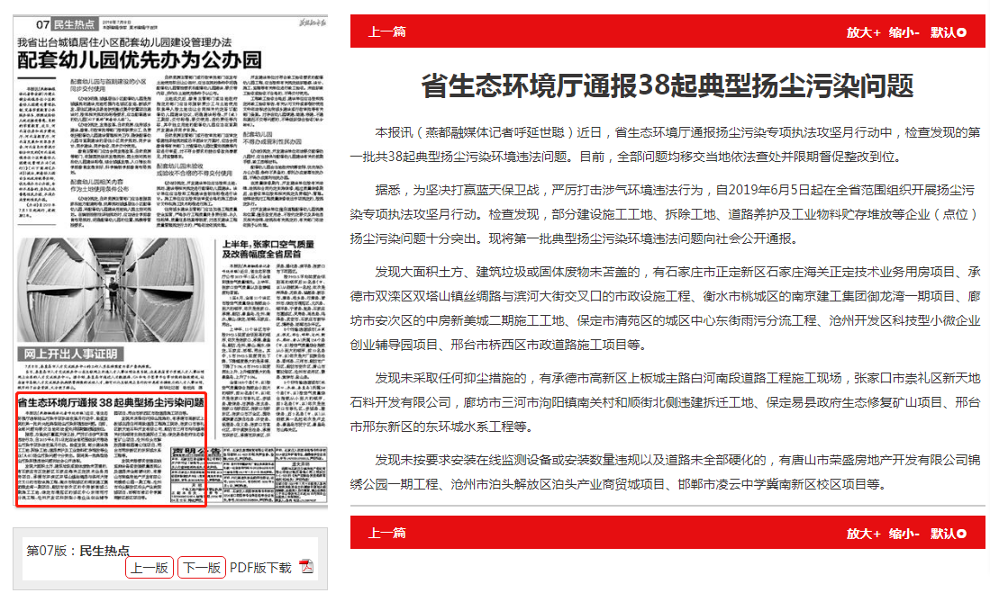 发现未采取任何抑尘措施的,有承德市高新区上板城主路白河南段道路工程施工现场,张家口市崇礼区新天地石料开发有限公司,廊坊市三河市泃阳镇南关村和顺街北侧违建拆迁工地、保定易县政府生态修复矿山项目、邢台市邢东新区的东环城水系工程等。