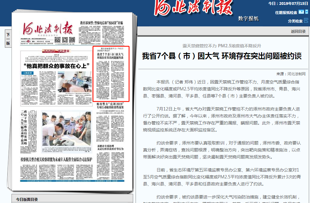 第五环境监察专员办公室近日还对大气环境存在突出问题的枣强县政府主要负责人进行了公开约谈。