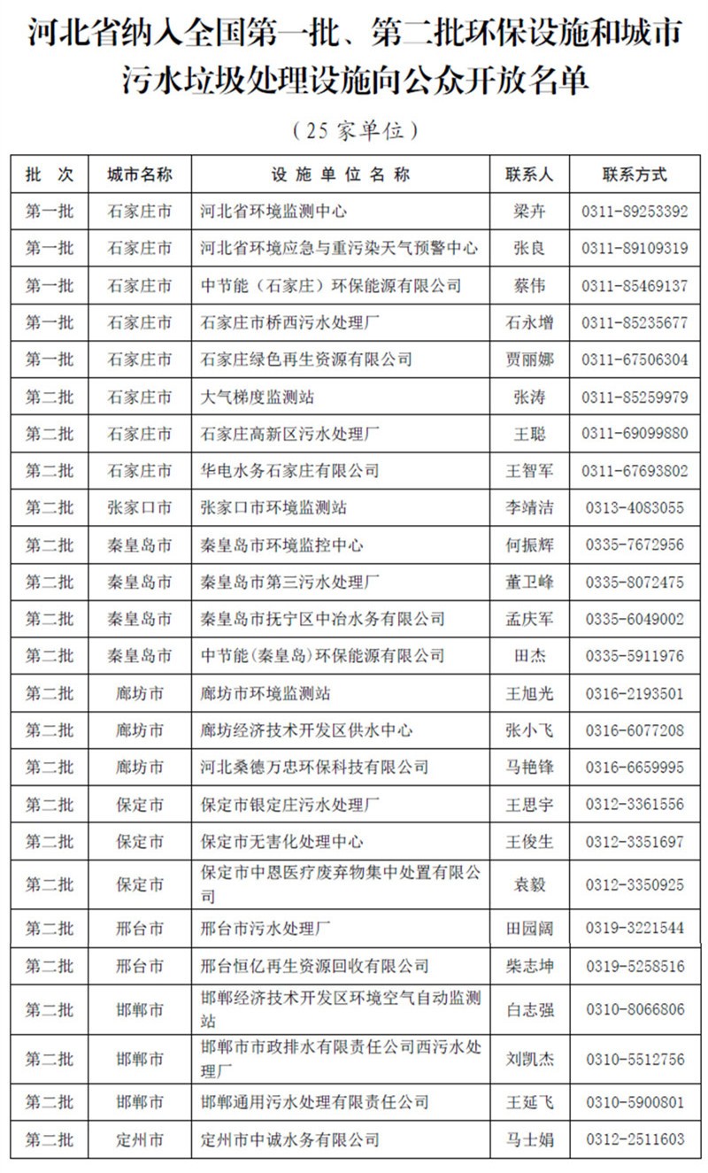 目前,河北省纳入全国第一批和第二批向公众开放的环保设施和城市污水垃圾处理设施单位已有25家。方案要求,25家环境设施开放单位至少每两个月开放一次。
