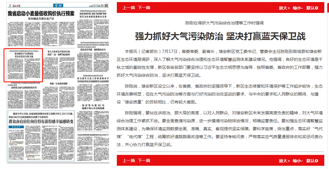陈刚说,雄安新区设立以来,在省委、省政府的坚强领导下,新区生态修复和环境保护等工作起步较快,生态环境改善明显,但在大气污染防治等方面与打好污染防治攻坚战的要求、与中央的要求和人民群众的期待、与建设“雄安质量”的目标相比,仍有较大差距。