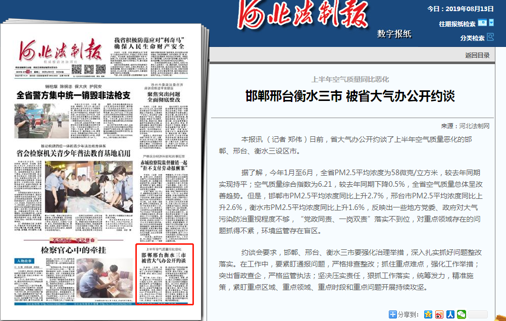 河北法制报:上半年空气质量同比恶化 邯郸邢台衡水三市 被省大气办公开约谈