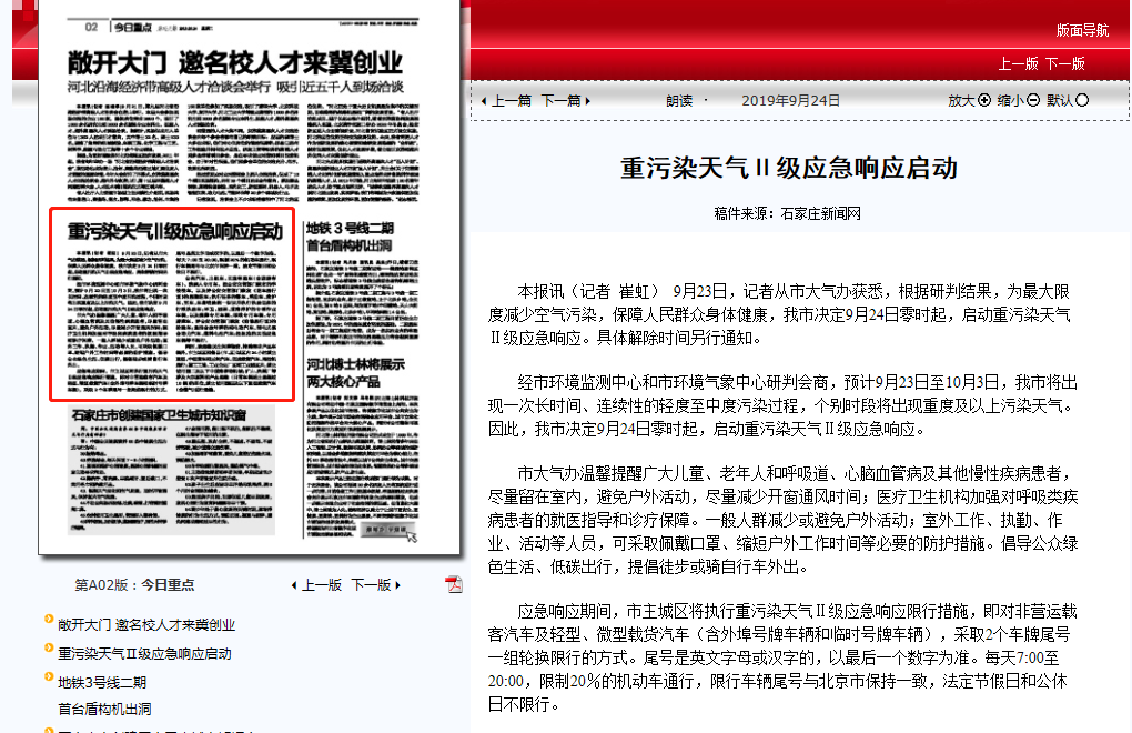 燕赵晚报:重污染天气Ⅱ级应急响应启动