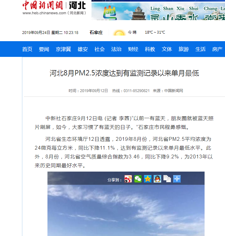 中国新闻网:河北8月PM2.5浓度达到有监测记录以来单月最低