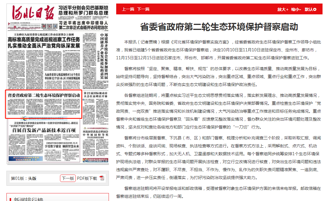 河北日报:省委省政府第二轮生态环境保护督察启动
