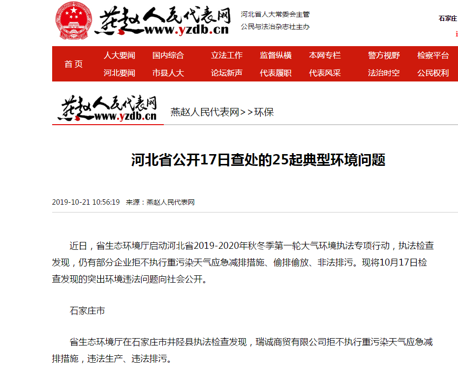 近日,杏彩(中国)官方网站 启动河北省2019-2020年秋冬季第一轮大气环境执法专项行动,执法检查发现,仍有部分企业拒不执行重污染天气应急减排措施、偷排偷放、非法排污。现将10月17日检查发现的突出环境违法问题向社会公开。