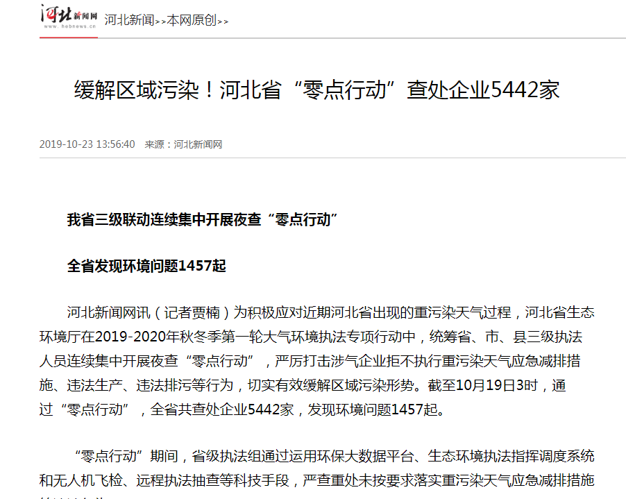 在2019-2020年秋冬季第一轮大气环境执法专项行动中,统筹省、市、县三级执法人员连续集中开展夜查“零点行动”,严厉打击涉气企业拒不执行重污染天气应急减排措施、违法生产、违法排污等行为,切实有效缓解区域污染形势。截至10月19日3时,通过“零点行动”,全省共查处企业5442家,发现环境问题1457起。