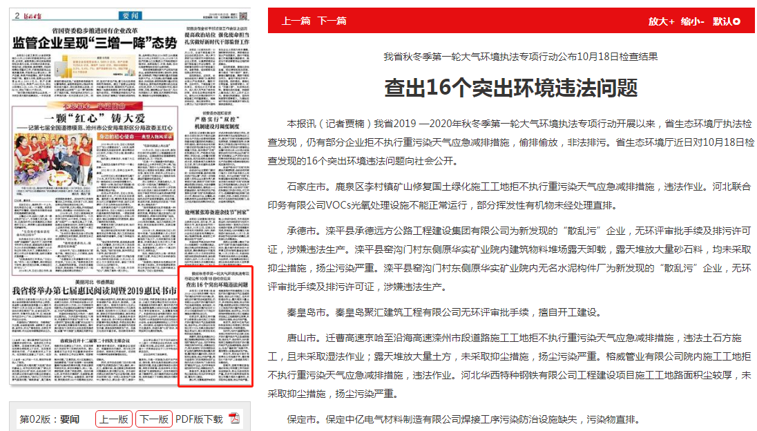 石家庄市。鹿泉区李村镇矿山修复国土绿化施工工地拒不执行重污染天气应急减排措施,违法作业。河北联合印务有限公司VOCs光氧处理设施不能正常运行,部分挥发性有机物未经处理直排。