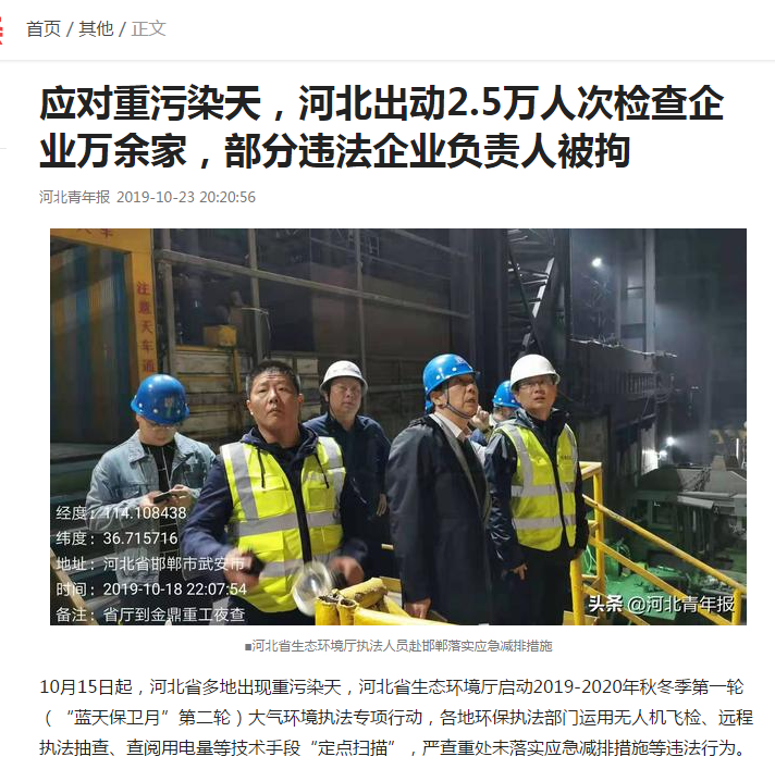 河北青年报:应对重污染天,河北出动2.5万人次检查企业万余家,部分违法企业负责人被拘